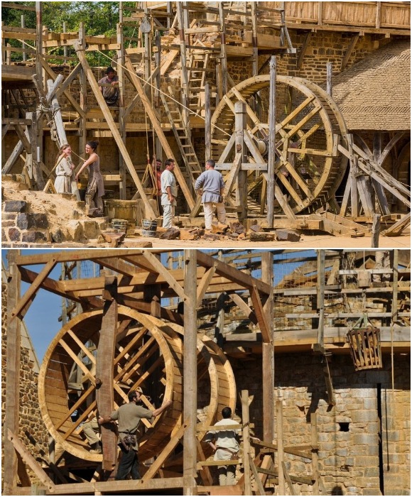 Для подъема стройматериалов на высоту использовали механические деревянные колеса, которые были доступны и для средневековых мастеров (Guedelon Castle, Франция).