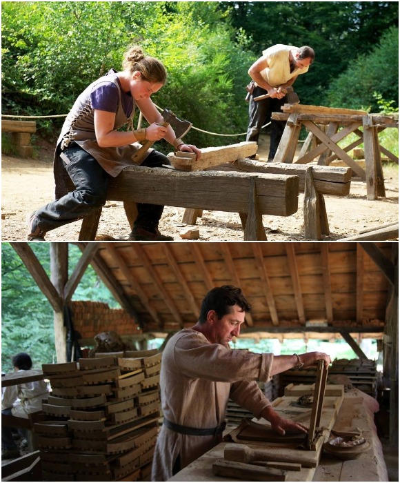 Плотницкие и столярные работы требуют особенного внимания и мастерства, ведь выбор ручного инструмента был не так уж и велик (Guedelon Castle, Бургундия).