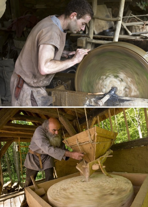 Для того чтобы организовать работу и быт советующий Средневековью были созданы мастерские, кузница, мельница и построены хижины (Guedelon Castle, Франция).