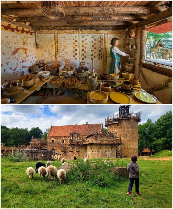«Средневековые» работники живут в советующих хижинах, выращивают овощи и скот, кушают то, что ели в былые времена (Guedelon Castle, Бургундия). Все без исключения участники стройки живут в деревянных хижинах, носят полотняную одежду, готовят на костре или в печи только те нехитрые блюда, которые были популярны в этих местах в XII-XIII веках. Для приготовления пищи используют крупы и муку, которые сами же перемололи с помощью каменных жернов, установленных на водяной мельнице. Они также выращивают овощи, птицу и домашних животных для праздничных блюд, которыми потчуют любопытных туристов, приезжающих посмотреть, как продвигается строительство. Кстати сказать, труд путешествующих приветствуется, и каждый гость может внести свою лепту в строительство или попросту поучаствовать в мастер-классах, где покажут все премудрости средневековых ремесел. Особо заинтересованные могут и пожить в хижине с аутентичным интерьером, питаясь сугубо средневековыми блюдами. На туризме здесь неплохо зарабатывают, по подсчетам устроителей, ежегодно эта сумма достигает 4,5 млн. евро, хотя без первоначальных вложений не обошлось. На начальном этапе власти региона, некоторые учреждения и компании, включая Caisse des dépôts et consignations и Electricité de France, а также меценаты (иногда и анонимные) выделили 400 тыс. евро. Сейчас же надобности в дополнительных финансовых вливаниях нет никакой нужды, поскольку организаторы «средневекового» строительства разработали несколько развлечений для туристов, которые позволяют продолжать стройку без ограничений.