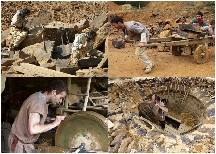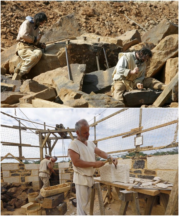 Камни для строительства добывали вручную в ближайшей каменоломне, а обтесывали на стройплощадке (Guedelon Castle, Франция).