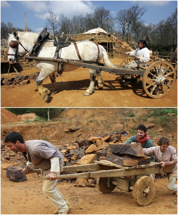 Для транспортировки строительных материалов используют лишь повозки с лошадями и ручные тележки (Guedelon Castle, Бургундия).
