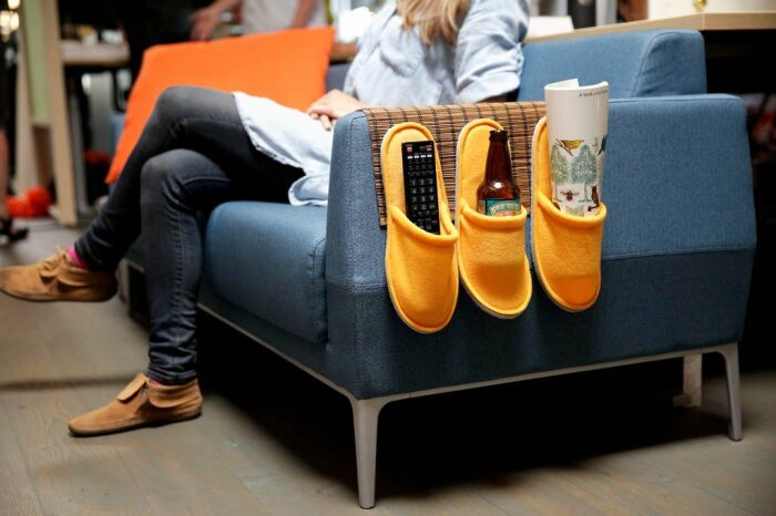 Согласитесь, что в карманах ой, как удобно, носить ключи от квартиры, телефон и прочую мелочь. Именно поэтому, некоторые смекалистые умельцы придумали использовать кармашки для хранения мелочей в доме, которые зачастую валяются по всей квартире. Как правило их крепят на боковые стороны дивана или кресла, чтобы складывать пульт, зарядку от телефона, зажигалку или какие-то косметические средства, которые всегда должны быть под рукой.
