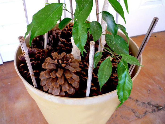 Шишки прекрасны в использовании для детских поделок и домашнего декора. А также, они служат главным отпугивателем для настырных котов, так и норовящих залезть в вазон с цветами, дабы там сделать свои дела или вывернуть наизнанку очередное растение. Просто выложите слой шишек поверх земли в вазоне и они прослужат вам верой и правдой не один день, надежно защищая растения от кошачьих покушений.