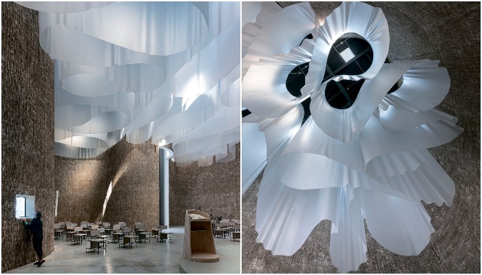 Но все же главным украшением стала драпировка из полупрозрачной ткани, спускающаяся с 16-метрового потолка. Белоснежные волны, обвивают друг друга, словно бесконечное отражение формы здания, освещаясь лучами солнца, проникающего сквозь потолочные люки, наполняют пространство главного зала особенной святостью. Такое эффектное сопоставление мягкого и твердого, холодного и теплого формирует сложность восприятия архитектуры и дизайна религиозного объекта, превращая его в настоящее произведение искусства.