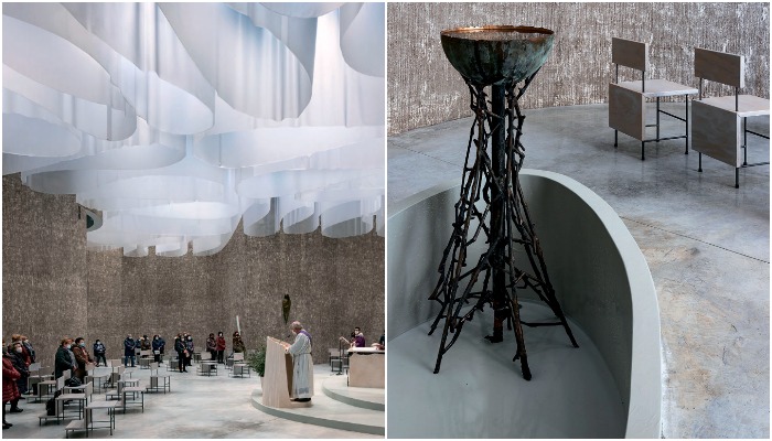 Каменные стулья и чаша для крещения сделаны по эскизам дизайнеров архитектурной студии Mario Cucinella Architects (Santa Maria Goretti, Италия).