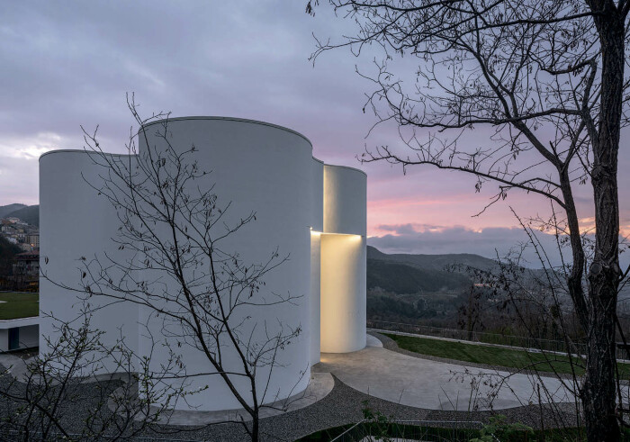 План размещения храмового комплекса на вершине холма в Морманно (Santa Maria Goretti). Если говорить о формах самого здания, то авторы проекта приложили максимум усилий, чтобы оно получилось величественным и запоминающимся, даже несмотря на то, что на фасаде не увидишь ни роскошного декора, ни колонн с портиками, украшенными множеством скульптур. Круглые формы фасада, образующие элегантную оболочку, пересекаясь друг с другом, указывают на вход в церковь, открывая сложные детали конструкции. Несмотря на кажущуюся простоту и максимальную лаконичность бетонного объема, культовый объект выглядит очень впечатляюще.