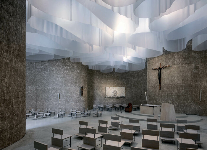 Драпировка из полупрозрачной ткани эффектно спускается с вершины 16-метрового потолка (Santa Maria Goretti, Италия).