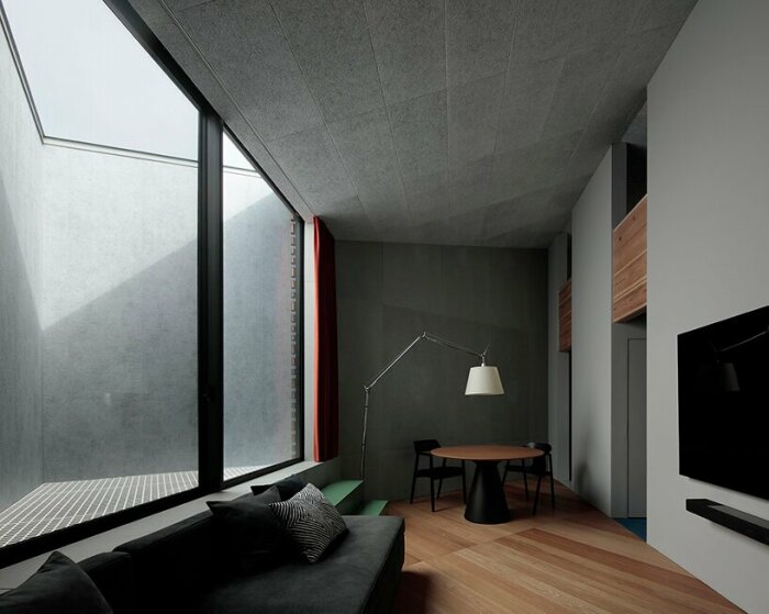 Примечательно: Предусмотрев все особенности участка и нормы строительства, дизайнерам удалось удовлетворить и запросы клиентов, которые пожелали иметь дом, где максимально надежно защищена приватная жизнь семьи. Это было важной оговоркой, поскольку жилище расположено в людном районе, в окружении людей, машин и зданий. Именно это пожелание вынудило архитекторов спрятать лицевой фасад Murakoshi House, такое название получил проект, за глухими металлическими панелями, начинающимися стразу с цокольного этажа. Хотя без естественного освещения жильцов не оставили, разработчики предусмотрели атриум со стороны внутреннего двора, а также масштабное остекление крыши.