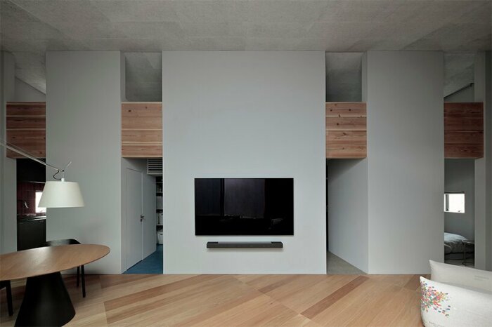Открытая планировка зоны гостиной-столовой делает пространство более объемным (Murakoshi House, Токио). | Фото: usa.firenews.video.