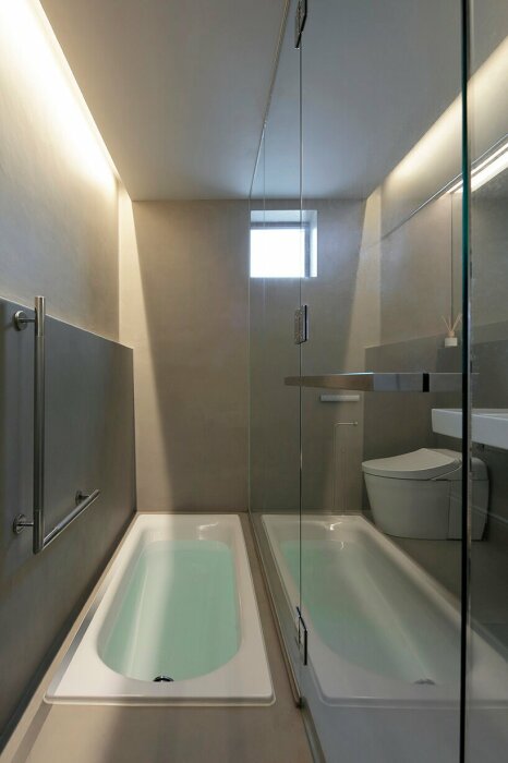 Чтобы расширить пространство узкой ванной комнаты, шкаф установили с зеркальным фасадом (Murakoshi House, Япония). | Фото: kqeducationgroup.com.