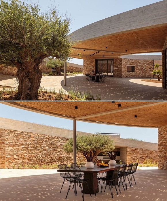 По этой причине молодое лимонное дерево стало главным объектом, вокруг него и появилось круглое строение, архитектурные формы которого органично перекликаются с аморфной топографией склона. Дерево оказалось в центре внутреннего двора, который огибают каменные стены вперемешку с панорамным остеклением и сквозными пролетами. Несколько старых оливковых деревьев стали главной изюминкой оформления придомовой территории, вокруг которых извиваются бетонные дорожки, в некоторых местах образующие зоны отдыха на свежем воздухе. А вот затенение для этих площадок обеспечивают не деревья, ввиду их скромных размеров, ведь они больше напоминают топиарии или такой себе природный бонсай.