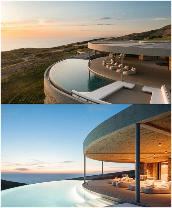 Зона отдыха с уютными диванчиками возле бассейна (о. Антипарос, Cronus). | Фото: designboom.com.