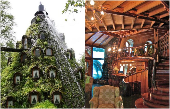 Глядя на этот волшебный домик, который как будто вырастает из-под земли, трудно поверить, что это не арт-инсталляция или декорация к какому-нибудь фэнтезийному фильму. Однако речь идёт действительно о гостинице, причём её ничего не помешало быть построенной на территории биологического заповедника Уило-Уило. Внешне отель напоминает не то гору, не то вулкан, который зарос буйной растительностью и непрерывно извергает воду вместо лавы. А попасть внутрь можно только через подвесной мостик на уровне середины сооружения. Кстати, вулкан там действительно есть, но рядышком - из нескольких окон открывается вид на Мочо-Чошу-Энко.