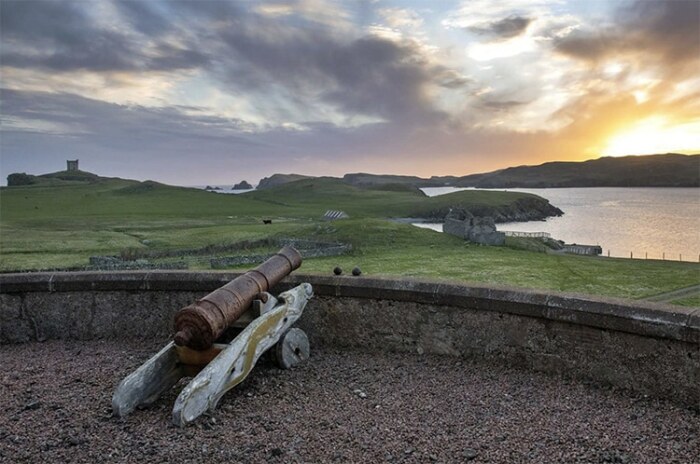 Возле башни установлена старинная пушка (The Isle of Vaila, Шотландия). | Фото: mymodernmet.com.