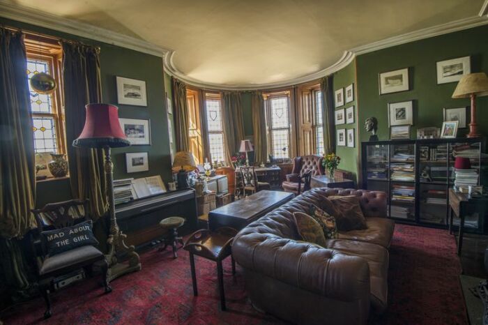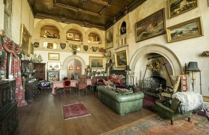 Баронский зал-кабинет с роскошным диваном и настоящим камином напомнит новым владельцам о пристрастиях в оформлении интерьеров более 100 лет назад (Vaila Hall, Шотландия). | Фото: countryliving.com.