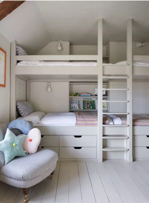 Порой не все комнаты в купленном доме имеют 4 угла в разрезе. Хотя это, несомненно, часть их очарования, это может сделать поиск фабричной мебели сложнее. Встроенная мебель на заказ часто работает намного лучше в неудобных пространствах, например, с неровными стенами и наклонными потолками, гарантируя, что каждый уголок будет учтен и использован. Чтобы выжать из этой спальни на фото выше как можно больше полезного пространства, в нее были встроены двухъярусные кровати с местом для хранения вещей не только под ними, но и ЗА НИМИ (в стене), благодаря чему пространство используется на 140 процентов.