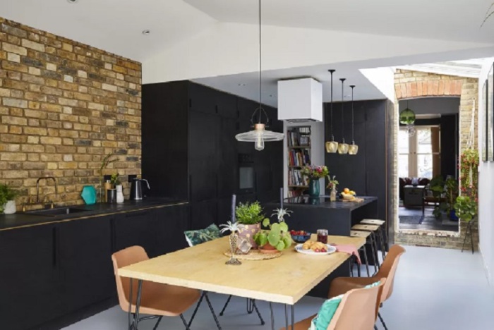 Одна из стильных идей ремонта дома - оставить оригинальную отделку в первозданном виде. Она придает комнатам деревенско-индустриальный уникальный вайб, а также доступна по цене, кроме того, сводит на нет необходимость в штукатурке и окончательной отделке. На фото выше открытая кирпичная кладка отлично контрастирует с гладким черным цветом новых кухонных гарнитуров и гладким виниловым полом.