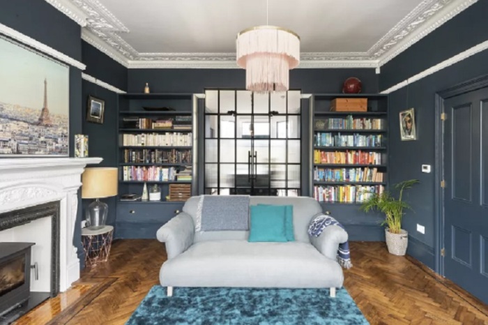 Наша коллекция идей по ремонту дома была бы неполной без архитектурной лепнины. Многие старинные дома были построены с использованием очень декоративных лепнин, таких как потолочные розетки и глубокие плинтусы. В загородном доме на фото были красивые лепнины на потолке и оригинальные камины, и владельцы ловко привлекли к ним внимание, создав цветовой контраст между белоснежным, в котором они были отделаны, и темно-синим, который они использовали на стенах и столярных изделиях.