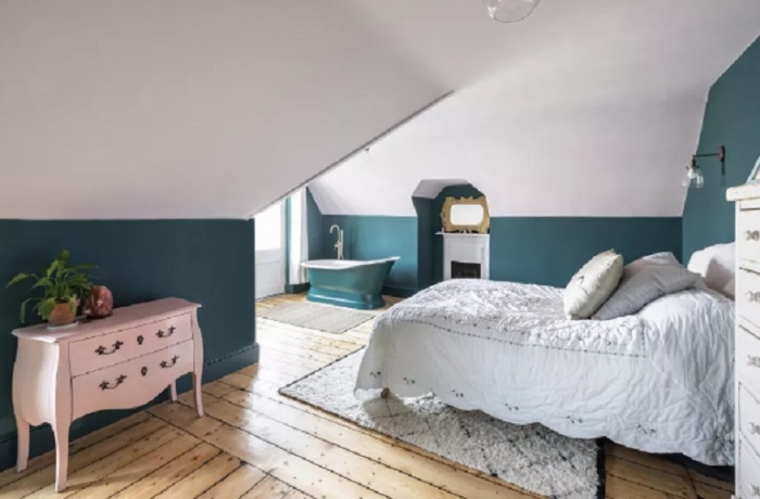 Независимо от того, выполняете ли вы преобразование лофта или просто задаетесь вопросом, что делать с проектом реконструкции дома с низкими или неуклюжими наклонными потолками, работайте с тем, что у вас есть, чтобы найти творческое решение. Подумайте, как вы могли бы использовать участки комнаты с очень низкими секциями потолка так, чтобы они не тратились впустую? Возможно, они могли бы занять место для встроенного хранения или стать местом для небольшого письменного стола или уютного кресла. Фото ярко показывает, что нет ненужного пространства при наклонном потолке.