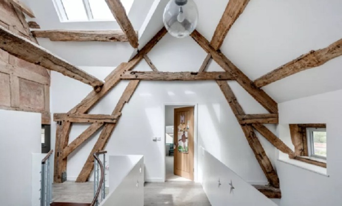 Обнажение оригинальной ткани старого дома может не только придать характер интерьерам проекта реконструкции, но также стать приятным намеком на историю здания. Посмотрите на этот открытый деревянный каркас на фото.Во ыремя работы над данным проектом был выполнен демонтаж самой старой части постройки, но было сохранено как можно больше оригинального дубового каркаса. В то время как некоторые из бревен можно было использовать в конструктивных (несущих) целях, всё остальное пошло по принципу превращения дефекта в эффект: те брёвна, которые были в самом плохом состоянии, в результате использовались в декоративных целях. Результат ошеломляет!