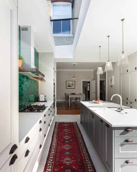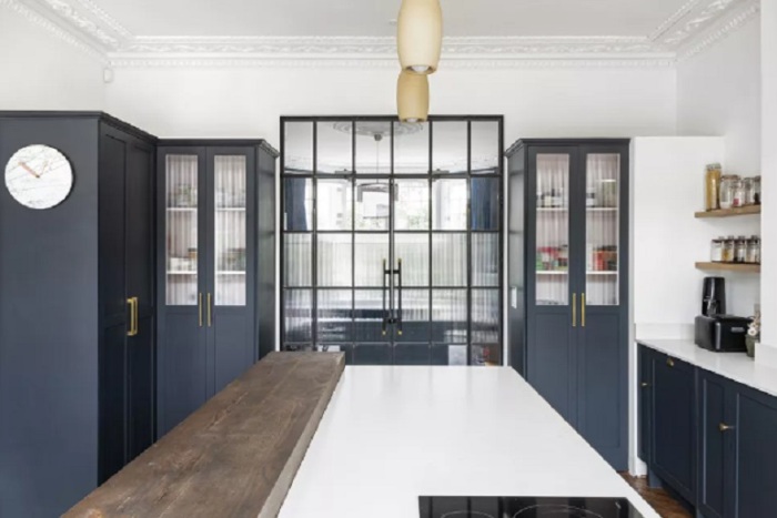 Стеклянные межкомнатные двери - блестящий способ, позволяющий свету течь между помещениями. Это часто является важным элементом дизайна в проектах реконструкции, особенно в домах с террасами, где в центральных комнатах часто может не быть окон или же они кажутся темными. Металлические межкомнатные двери в индустриальном стиле невероятно популярны и практичны, они добавляют стильный штрих, а также выполняют практическую роль. Двери на фото ненавязчиво разделяют кухню и жилое пространство.