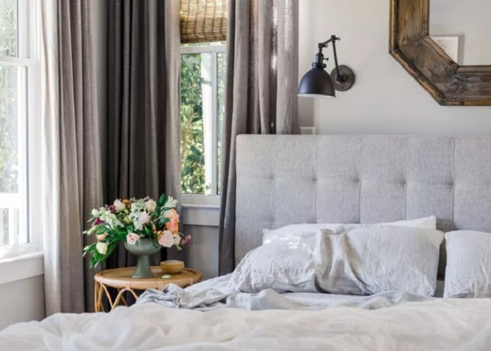 Выбор штор и жалюзи дает возможности, аналогичные использованию штор на двойном стержне. Вы можете закрыть оба для затемнения. Или вы можете просто опустить жалюзи, но открыть их, чтобы было немного света и видимости. Добавление штор поверх жалюзи также помогает одеть жалюзи и смягчить их резкие линии в пространстве. Это отличный вариант, если у вас есть старые жалюзи, которые все еще функциональны, но не обязательно привлекательны для вас. Варианты, которые предоставляет эта комбинация, хороши для создания различных условий освещения и уединения в спальне.