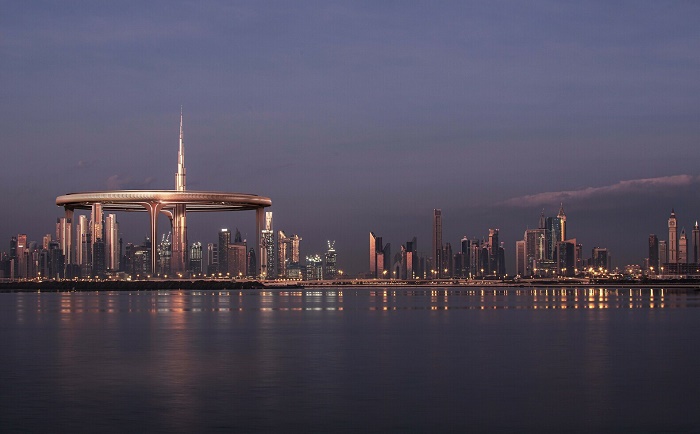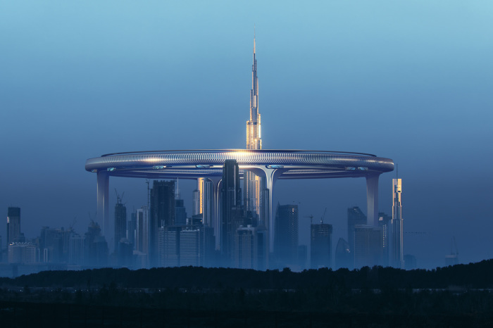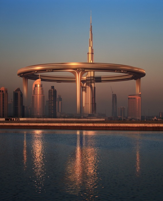 В Дубае, в рамках преобразований делового района Downtown, планируют построить горизонтальный небоскреб в виде гигантского кольца, который эффектно обвивающегося вокруг мирового рекордсмена – высотки Бурдж-Халифа. Неординарность амбициозного проекта заключается в том, что 3-километровый футуристический спутник не будет занимать драгоценные земли, а «зависнет» на высоте 550 метров, обеспечивая будущих жителей города в городе умопомрачительными видами, чистым воздухом и органичными продуктами.
