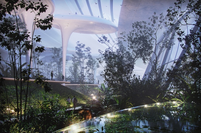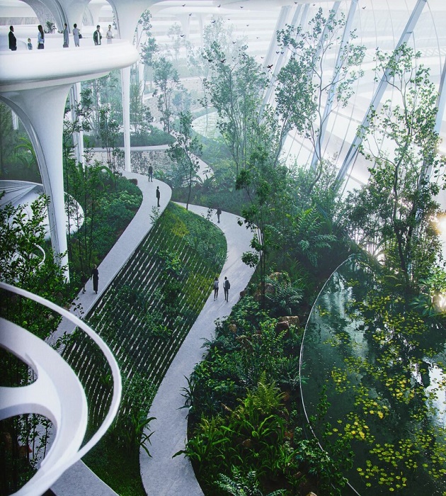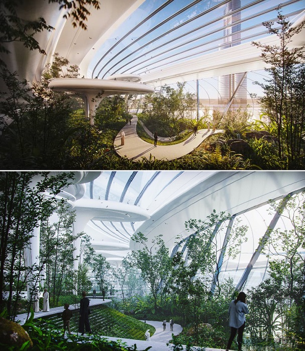 В зеленом поясе Skypark можно прогуляться по тропическим джунглям, болотам и песчаным дюнам, наслаждаясь красотой рукотворных озер и водопадов (концепт Downtown Circle). | Фото: masterok.livejournal.com.