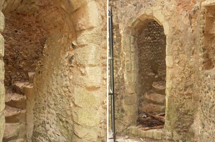 В древнем замке сохранилась каменная лестница, ведущая на верхние этажи (Thetford Warren Lodge, Великобритания).