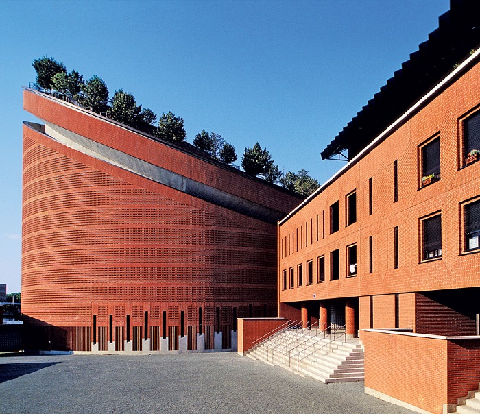 Архитектор Марио Ботта, который создал этот храм, с виду больше напоминающий университетский кампус, как ни странно, вдохновлялся византийской архитектурой. Именно это объясняет присутствие характерных для последней округлых форм - а Собор выполнен в форме усечённого цилиндра - и использование сырого кирпича. По периметру скошенной овальной крыши высажены 24 липы, и это число несёт сразу несколько символичных значений: во-первых, это 24 часа в сутках, а во-вторых, 12 колен Израилевых и 12 апостолов. Крыша же у здания стеклянная, а опирается на несущий металлический треугольник, который также является символом - обозначает Троицу.