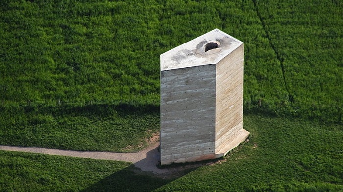 Нетривиального вида здание, которое буквально вырастает посреди чистого поля, как ни странно, является капеллой. Занимательным выглядит и процесс её возведения: по информации редакции Novate.ru, первоначально был построен сосновый каркас, затем его залили бетоном, а потом деревянную часть попросту сожгли - именно поэтому внутри церкви высотой в 12 метров до сих пор обугленные стены. А основным источником света в этой в буквальном смысле слова бетонной коробке является отверстие в потолке микропантеона.