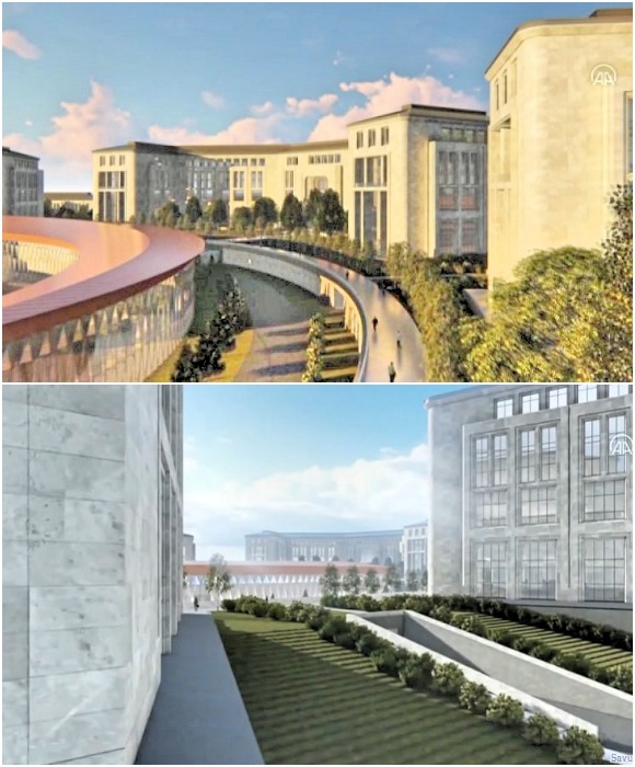 В здании Ay Yildiz будут размещаться все управление силовыми структурами Турции (концепт). | Фото: m.turkiyegazetesi.com.tr. Стоит отметить, что здания в виде звезды и полумесяца будут вполне функциональны, в них планируют разместить центральный вход и выставочные пространства (звезда), а вот полумесяц займут несколько конференц-залов как для общих заседаний, так и для каждого военного штаба и министерства по отдельности. Управленческие структуры всех без исключения родов войск: Генеральный штаб и Министерство национальной обороны страны, командование Сухопутных, Воздушных и Военно-морских сил Турции будут размещены в отдельных корпусах. Необходимость строительства столь грандиозного комплекса возникла лишь потому, что все силовые структуры на данный момент располагаются в старых зданиях исторической части Анкары – столицы Турции.