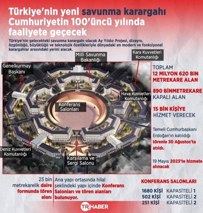 Власти Турции всерьез озадачились строительством военно-административного комплекса с присущим для восточных стран превосходством. Новый амбициозный проект Ай Йылдыз (тур. Ay Yildiz, англ. Moon and Yildiz, «Полумесяц и звезда»), который вскоре будет реализован в районе Этимесгут (Анкара), превзойдет американский Пентагон в несколько раз. Как стало известно редакции Novate.ru, закладка фундамента прошла 30 августа 2021 г. (котлованы были к тому времени уже готовы), в национальный праздник День победы, который в тот момент отмечался в 99 раз.