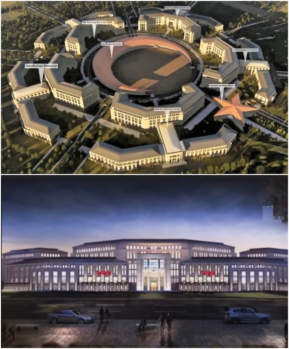В Турции полным ходом идет строительство нового военно-административного комплекса, который значительно превзойдет американский Пентагон. Проект собственного Пентагона, получивший название «Полумесяц и звезда», хоть и имеет пятиугольную форму, тем не менее предусматривает наличие зданий, повторяющих очертания главных символов страны. По словам Эрдогана, новый объект «будет вселять ужас в наших врагов и уверенность в наших друзей».
