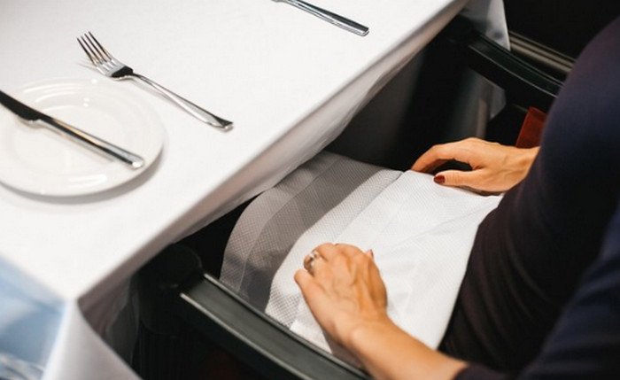 1. Свернутую салфетку берут в щепоть и легонько встряхивают в стороне от посуды. Это сигнал к началу трапезы. В домашней обстановке первой это делает хозяйка (или хозяин при ее отсутствии), в ресторане - женщина. Если за столом одни мужчины, сначала за салфетки берется пригласившая сторона. В ресторане до подачи первого блюда салфетки не трогают, даже если заказ уже сделан и вы начали с аперитива. 2. Салфетку складывают пополам и кладут на колени открытым краем в свою сторону. За воротник салфетку ни в коем случае не заправляют, эта традиция устарела. 3. Во время еды пальцы вытирают лежащей сверху половинкой салфетки, не убирая ее с колен. 4. Если надо промокнуть губы, отогните первый слой ткани салфетки на 5—7 см, поднимите к лицу в развернутом виде, придерживая за сгиб. После чего верните изделие на колени вниз чистой частью. 5. Если матерчатая салфетка упала на пол, ее не поднимают, а просят новую у хозяйки или официанта. 6. Если надо на время выйти из-за стола, салфетку надо положить на стул. Это знак, что гость еще вернется к столу. 7. Когда трапеза закончена, салфетку берут за центр и кладут слева от тарелки.