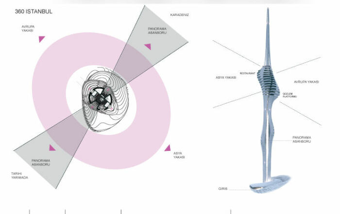 В Стамбуле, где встречается Европа с Азией, совсем недавно была построена сверхвысотная телебашня, которая очень быстро стала новой достопримечательностью старинного города. Благодаря стараниям коллектива сразу двух архитектурных компаний гости и местные жители могут не только наслаждаться футуристическими формами сооружения, высота которого достигает 369 м, им оказались доступны впечатляющие развлечения во время подъема в панорамных лифтах или посещения смотровых площадок и ресторанов на самой ее вершине, откуда можно увидеть два континента одновременно.