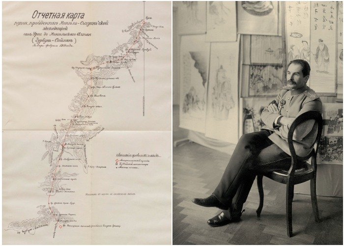 Русский географ Петр Козлов и карта маршрута, по которому прошла первая экспедиция в поисках мертвого города Хара-Хото.
