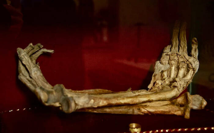 Фрагменты мумифицированных рук выставлены в прозрачном ящике в назидание воришкам (Cappella di San Galgano, Кьюздино). | Фото: allthatsinteresting.com.