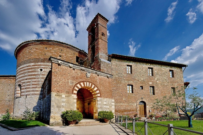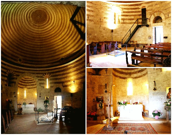 Капелла Сан Гальгано Монтесипи — единственная романская ротонда в Тоскане. Построенная по образцу классического мавзолея и церкви Гробницы в Иерусалиме, ее форма напоминает чашу – Святой Грааль. Выдающаяся форма затмевает более скромный экстерьер, поскольку в качестве отделочного материала использовали бледного цвета травертин (известняковая горная порода) и темный кирпич, которым в те годы строители южных районов Тосканы заменяли мраморную инкрустацию.