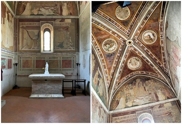 Внутреннее убранство капеллы тоже не отличается особой роскошью, к которой привыкли посетители величественных храмов большинства концессий. Ступенчатый купол, полосы чередующихся цветов, несколько поразительных фресок Амброджо Лоренцетти, побеленные каменные стены – вот и все убранство древней святыни. Но прибывающих сюда туристов притягивает не эта скромная простота или легенды об итальянском рыцаре Гальгано Гуидотти, ставшим Святым, многие стремятся увидеть тот самый меч (некоторые до их пор его принимают за Экскалибур короля Артура), спрятанный под колпаком из оргстекла.