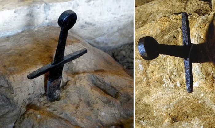 Еще один меч в скале сохранился во Франции и принадлежит он рыцарю Роланду (Меч по прозвищу Дурлиндана). | Фото: masterok.livejournal.com. Об этом свидетельствует и хрупкость древнего металла. Как оказалось, один из посетителей попытался вытащить меч (то ли из любопытства, то ли еще что), а он сломался у основания. Теперь на месте слома можно увидеть стальную скобу, фиксирующую вертикальное положение рукояти меча. Кстати сказать, подобные артефакты существуют и в других местах, особенно много их было в Шотландии и в самой Италии.