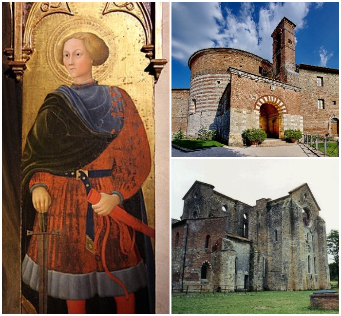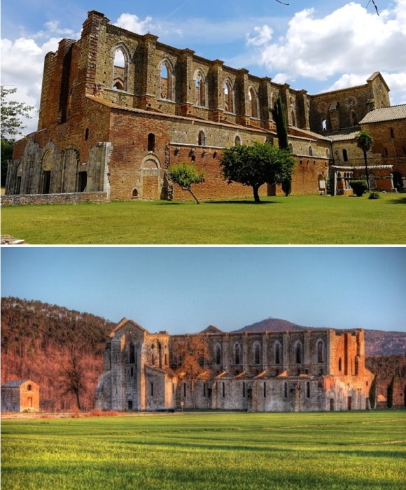 После того, как уверовавший рыцарь был причислен к Лику Святых, в честь него была построена не только часовня. За 60 лет возле холма, рядом со скитом отшельника, был воздвигнут монастырь – Аббатство Сан Гальгано (Abbazia di San Galgano; 1220–1280 гг.), который в тот период играл довольно значимую роль в жизни региона. После 200 летнего процветания величественный объект начал приходить в упадок. Междоусобицы и страшные эпидемии, свирепствующие в Европе, привели к обнищанию, постепенному угасанию ордена цистерианцев и самого архитектурного объекта.