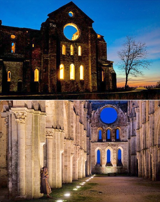 Несмотря на разруху, археологический памятник привлекает туристов, ради которых его подсвечивают в темное время суток (Abbazia di San Galgano, Италия).