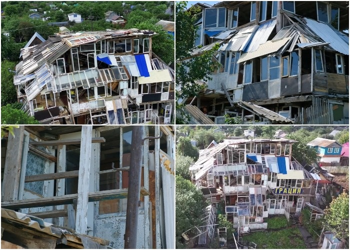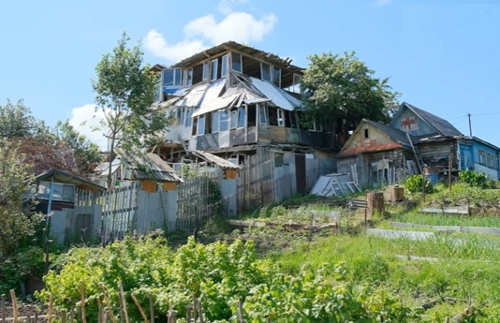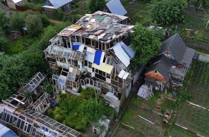 Все бы ничего, но креативный владелец в качестве строительного материала выбрал старые оконные рамы, балконные блоки, старые двери, куски шифера, рубероида, фанеры и прочий хлам, который горожане попросту выбрасывают на мусор, делая в квартирах/домах ремонты. При этом мастеру захотелось еще и потешить свои амбиции, замахнувшись на довольно масштабное строительство – пятиэтажное сооружение, занимающее значительную часть земельного надела.
