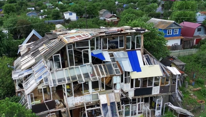 Креативный архитектор-самоучка из Нефтекамска на своем дачном участке решил в полной мере реализовать творческий потенциал. Насобирав сотни старых оконных рам, балконных дверей, кусков шифера и кучу хлама он построил ...пятиэтажный дом, занявший большую часть земельного надела. Такому соседству совсем не рады члены СНТ «Нефтяник», которые опасаются, что сильный порыв ветра может разнести «Дом-монстр» по всей округе, что совсем небезопасно для людей. Но владельцу столь эксцентричной постройки все нипочем, ведь он уверен, что «на своем участке может делать все, что ему заблагорассудится». Так ли это, попробуем разобраться и мы.