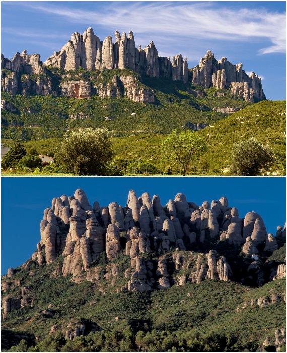 Интересный факт от Novate.ru: Гряда Монсеррат (высота – 1236 м, длина – 10 км и ширина – 5 км) образовалась вместе с горной системой Пиренеи, но в результате различных геологических процессов отклонилась от основного массива. Ветер, вода и время образовали около 1,2 тыс. тех самых удивительных скал («лысых» идолов), самые впечатляющие из которых получили красноречивые имена, соответствующие их причудливой форме – «Мумия», «Божий перст», «Стульчик», «Просверленная скала», «Голова слона», «Верблюд», «Конь Берната» и др. Учитывая такое многообразие, неудивительно, что Монсеррат является довольно популярным местом, но не только среди скалолазов, паломники и туристы выстаиваются в очередь, чтобы попасть на одно живописное плато, на котором находится одноименный мужской монастырь.