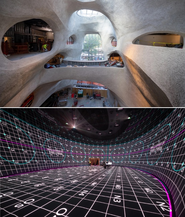 Несмотря на то, что снаружи новая структура кажется компактной, внутри она имеет совсем другой вид. Авторы проекта сделали все возможное, чтобы зрительно увеличить имеющуюся площадь, создавая впечатление простора и максимального объема. Особенно впечатляет масштаб вестибюля, над которым создан четырехэтажный атриум с особенной подсветкой. Органично изогнутые стены, имитирующие каньоноподобное пространство, над причудливыми формами которого потрудились ветер, вода и эрозия горных пород, позволило создать «здание в здании», с прилегающими этажами, галереями и переходами, расходящегося от ядра в разные стороны. В атриуме предусмотрены и мосты, и загадочные проемы, которые помогут установить физические и визуальные связи между многочисленными музейными пространствами и сделать многоуровневое и разностороннее движение музея более понятным. Разработчики надеются, что интригующая остановка и «тайные» ходы пробудят в посетителях «дух открытий, ведь оказавшись внутри гигантской пещеры с множеством разнообразных путей, они непременно захотят их исследовать».
