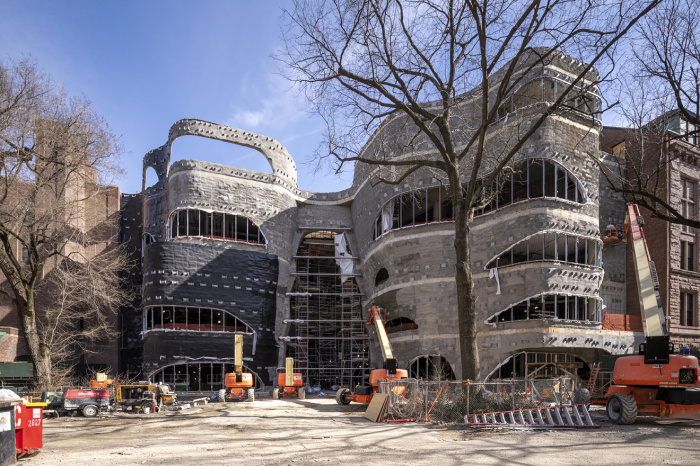 Кстати сказать, благодаря тому, что разработчики проекта отказались от монолитного строительства этого скульптурного элемента (этот метод потребовал бы масштабной опалубки правильных форм и пропорций), удалось создать столь неповторимый дизайн. Они использовали методику точечного бетона (торкрет-бетона) – процесса, впервые опробованного еще в начале XX века Карлом Экли, таксидермистом (чучельником) AMNH. Техника заключается в напылении бетона на арматуру или металлическую сетку, которым можно придать разнообразные формы, создавая текучие элементы (в отличие от опалубной заливки). Естественно, учитывая современные возможности, специалисты Studio Gang усовершенствовали дизайн контуров стен из торкрет-бетона с помощью параметрического проектирования и специального программного обеспечения для моделирования, уделяя особое внимание «сгибам» или краям, где стыкуются различные изогнутые поверхности. Если говорить об экстерьере пристройки, то волнообразная структура, облицованная розовым гранитом милфорд (материал, используемый в оформлении экстерьера главного входа в Центральный парк), прекрасно дополняет имеющийся ансамбль, расширяя входной пролет, соединяющий с 79-й улицей. Благодаря такому расположению и довольно масштабному остеклению посетители смогут увидеть «Манхэттен-Хендж» изнутри здания. Этот непонятный для большинства термин придумал астрофизик AMNH Нил де Грасс Тайсон для обозначения явления, которое происходит, когда заходящее или восходящее солнце совпадает с горизонтом и доступно это зрелище только с поперечных улиц Манхэттена. Стоит также упомянуть, что такое случается четырежды в год: в декабре, январе, мае и июле.