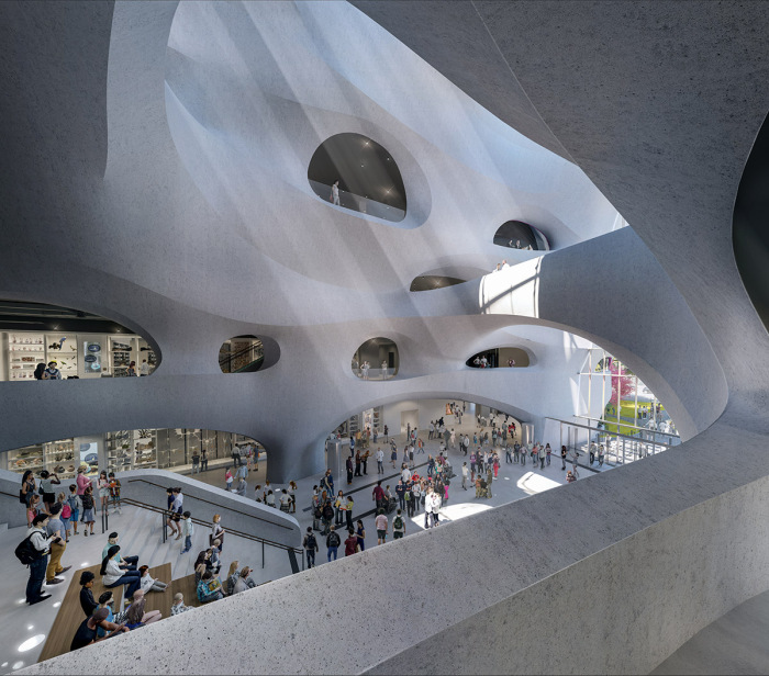 Атриум Кеннета С. Гриффина, парящее четырехэтажное общественное пространство, служащее воротами в Центр науки Гилдера (концепт реорганизации AMNH). | Фото: architecturalrecord.com.